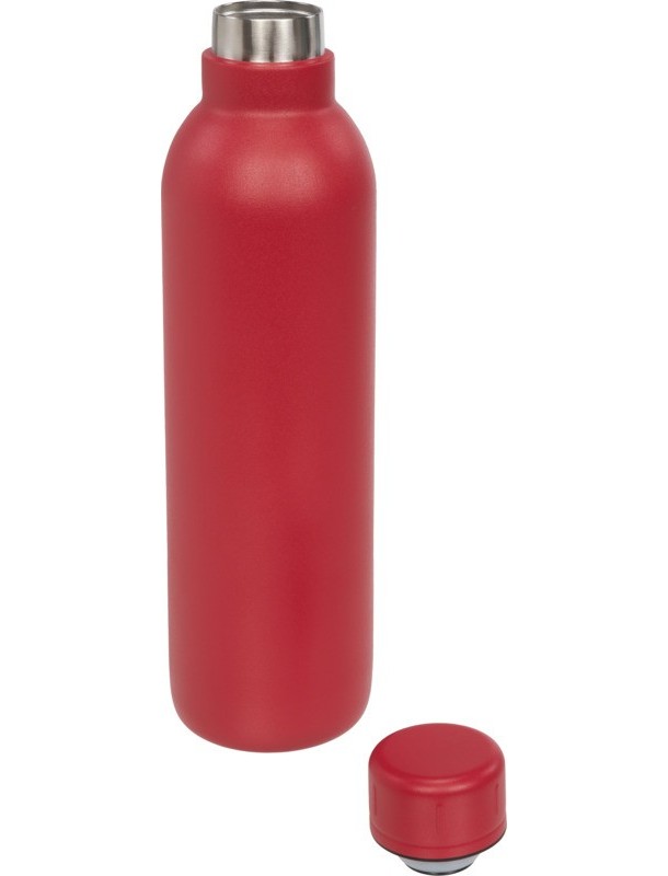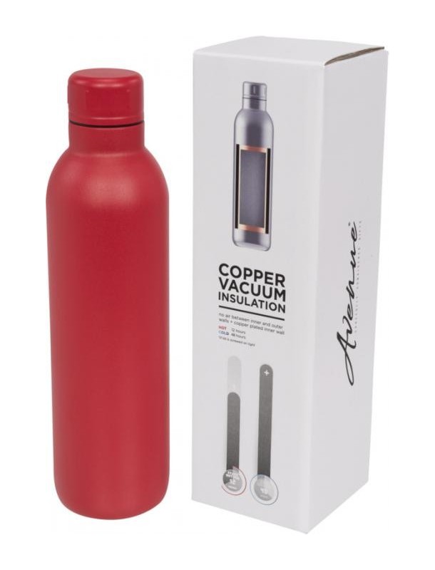 Bouteille de sport de 510 ml avec isolation par le vide et couche de cuivre Thor. Construction durable sous vide en acier inoxydable à double paroi avec isolation en cuivre, qui permet à votre boisson de rester froide pendant 48 heures et au moins 12 heures pour les boissons chaudes. La construction empêche également la condensation à l’extérieur de la bouteille. Revêtement en poudre tendance et durable. Couvercle étanche à visser en acier inoxydable. Capacité 510ml. Présentation dans un coffret cadeau Avenue. Acier inoxydable.