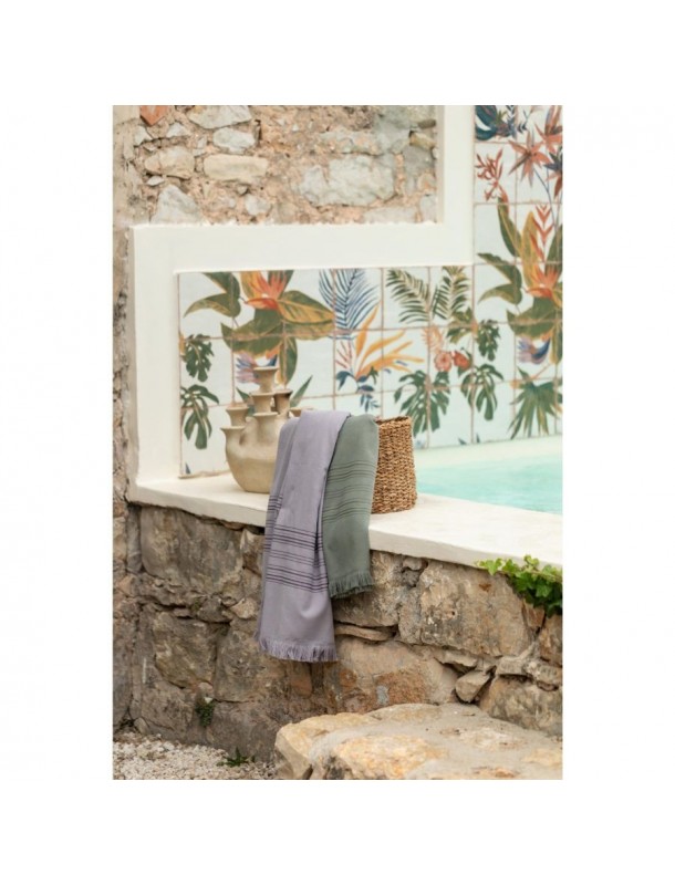 Fouta de la collection Cancun doublée en éponge de couleur Thym. Matière de la serviette : Pur coton. Dimensions du produit : 90 x 180 cm. Cette collection de serviette de plage vous envelopperont avec douceur à la sortie de votre bain. Recto voile ou verso éponge, choisissez le côté qui vous convient. Son liteau ciselé en font un accessoire à finition soignée.Avec un grammage de 300 GSM