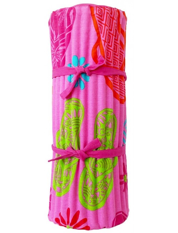 Matelas de plage pour bain de soleil. Facile à emporter grâce à sa bandoulière, ce matelas de plage apporte un super confort sur les plages de sable ou de galets. Original grâce à ses motifs fruités, il est idéal pour vos sorties à la plage ou sur votre transat au bord de la piscine. Très agréable grâce à sa qualité extérieure 100% coton, il est également très confortable avec son coussin intégré.